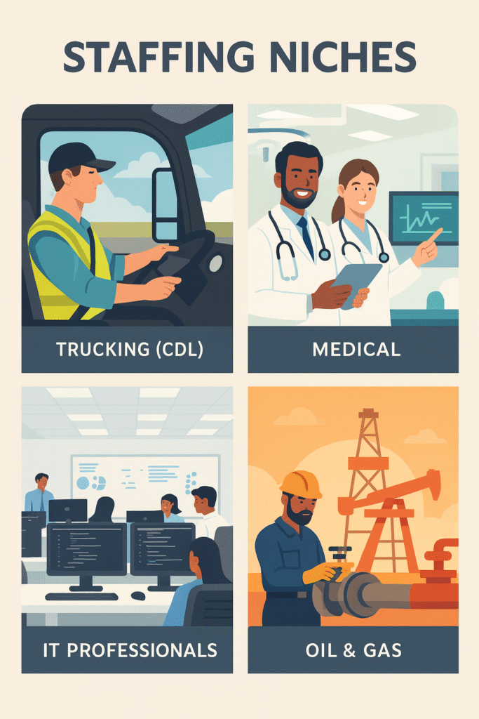 As the saying goes, “Everything is bigger in Texas.” This statement also holds true for the various sectors of the economy in different regions of Texas. Getting involved in a specific staffing sector can give you visibility in the market while you obtain in-depth knowledge of that particular area. Some examples could be: