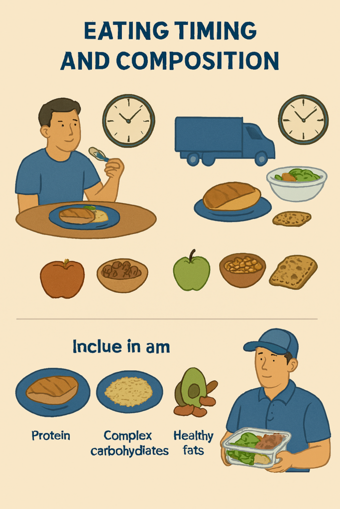 Mid-shift (break)Chicken & brown rice bowl + steamed veggiesSustains energy during long driving blocks